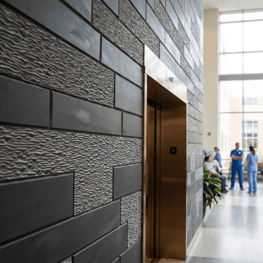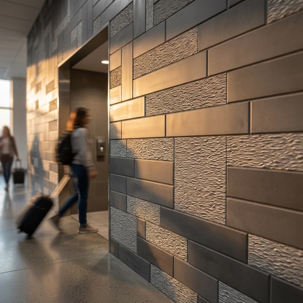 A structured grid of staggered, rectangular blocks creates a modern relief inspired by the clean lines of a city skyline. Geometric repetition and varying depths establish a sense of architectural order and structural strength. With Backlight enhancement, the recessed channels glow, casting sharp shadows that emphasize the pattern's crisp edges and bold verticality.
